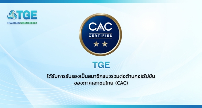 บริษัท ท่าฉาง กรีน เอ็นเนอร์ยี่ จำกัด (มหาชน) หรือ TGE ได้ประกาศเจตนารมณ์เข้าร่วมโครงการแนวร่วมปฏิบัติของภาคเอกชนไทยในการต่อต้านการทุจริต (CAC) เมื่อวันที่ 28 กุมภาพันธ์ 2565 และได้รับการรับรองเป็นสมาชิกแนวร่วมต่อต้านคอร์รัปชันของภาคเอกชนไทย เมื่อวันที่ 29 กันยายน 2566